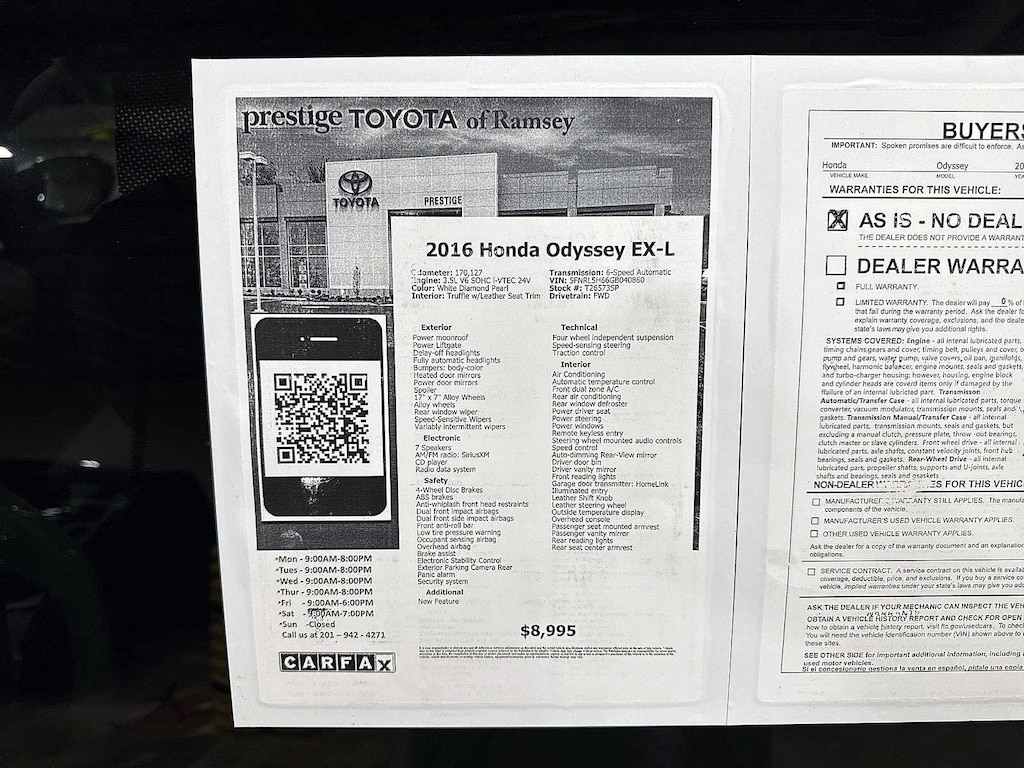 This 2016 Honda Odyssey EX-L will not make it to the weekend!! CALL NOW to reserve your test drive!! (844) 838-7075 Please Visit www.PrestigeToyota.com for further details. Price does not include licensing costs, registration fees, taxes and dealer doc fee of $999 which are to be paid by the consumer.